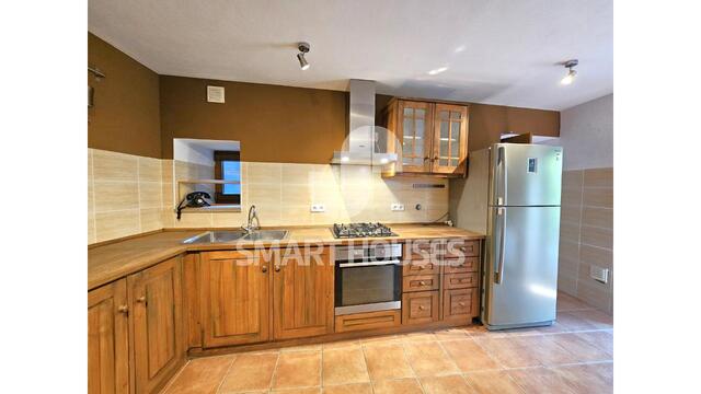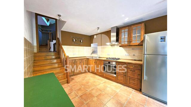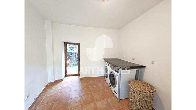 - Piso térreo: que se pode aceder diretamente pelo jardim para a cozinha, completamente mobilada com móveis desenhados e feitos à medida e equipada com electrodomésticos (forno, placa eléctrica e a gás, exaustor, frigorífico) e daqui para zona de lavandaria (com máquina de lavar e secar roupa) também com acesso direto ao exterior; a sala de jantar, com duplo pé direito, está ligada à cozinha e também dá acesso ao hall de entrada e/ou directamente ao exterior.