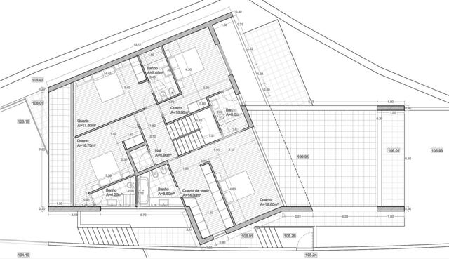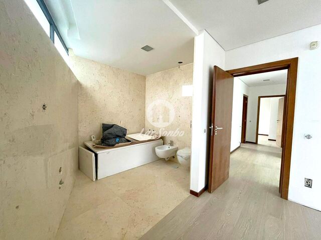 No primeiro andar dispõe de quatro quatros, suíte, com roupeiros embutidos em madeira sucupira e casas de banho com loiças suspensas. O quarto principal contem um closet e no wc uma banheira e uma base de duche, com acesso a um excelente terraço com 60 m2.