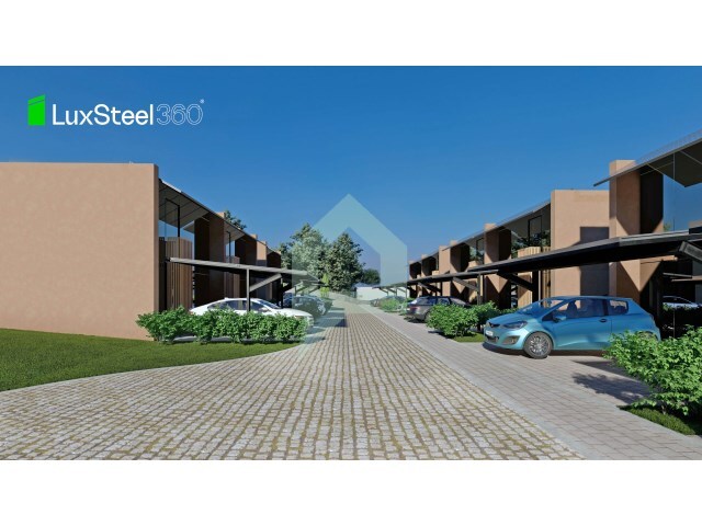 Dez moradias, em blocos de casas geminadas, outras isoladas, em regime de propriedade horizontal, com dois pavimentos, acesso direto a áreas comuns mínimas em condomínio fechado.