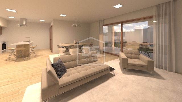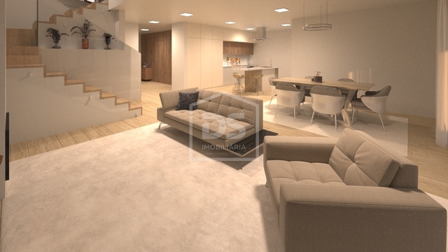 No rés de chão é composta por uma cozinha open space com sala jantar e de estar e um escritório e casa de banho.