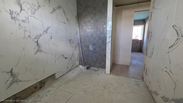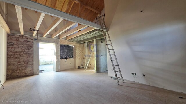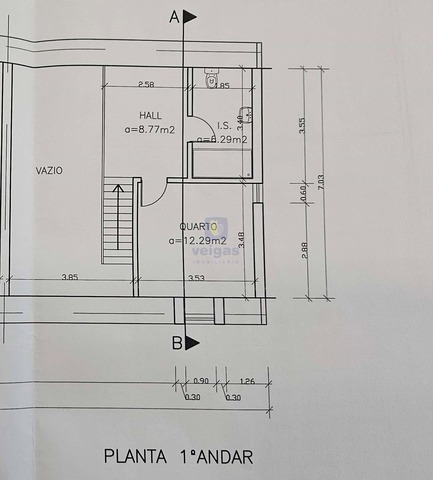 Ainda na sala encontra a escada em madeira que dá acesso ao piso superior, onde contém 2 quartos, um de 19m2 e outro de 9.52m2 com roupeiro embutido, este por sua vez não dispõe de iluminação natural.
