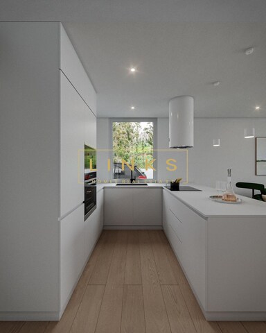 A entrada da moradia conduz a um hall espaçoso que dá acesso direto à cozinha e à sala de estar, formando um conceito em open space. A cozinha oferece amplo espaço de armazenamento, superfícies de trabalho funcionais e um layout pensado para eficiência e conforto. A sala de estar, ampla e luminosa, beneficia de grandes janelas que proporcionam luz natural durante todo o dia e permitem uma vista direta para a piscina e o espaço exterior.