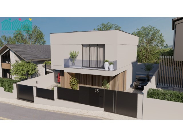 A parte exterior oferecer uma zona de lazer e descanso com uma simpática piscina e um agradável jardim. Dispõe ainda assim de lugar para duas viaturas em cada uma das laterais da moradia.