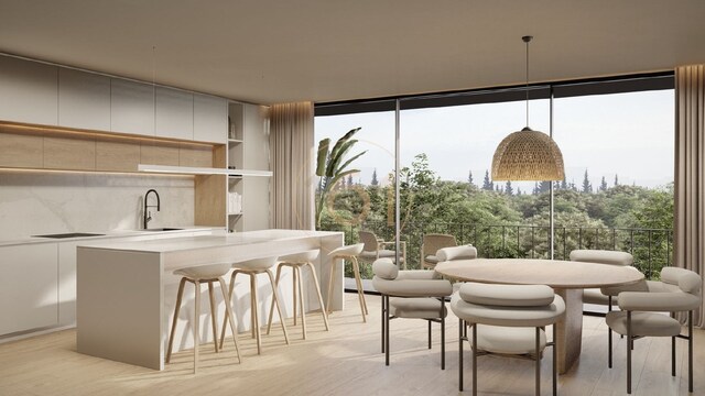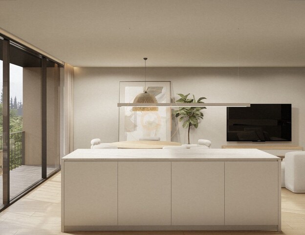 - Sala de jantar e cozinha em open space com ilha, totalmente equipada com eletrodomésticos Bosch e frigorífico Side by Side Beko
