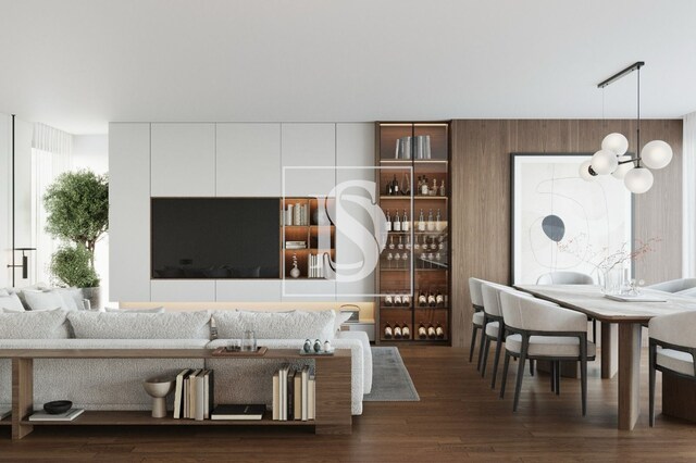 A zona social desenvolve-se em open space, integrando sala e cozinha, com uma área total de 60m² conforme planta, equipada com ilha central e eletrodomésticos Bosch, combinando design e funcionalidade. A sala, ampla e luminosa, assim como a cozinha, estabelecem uma ligação direta ao terraço.