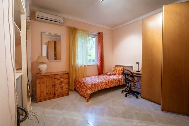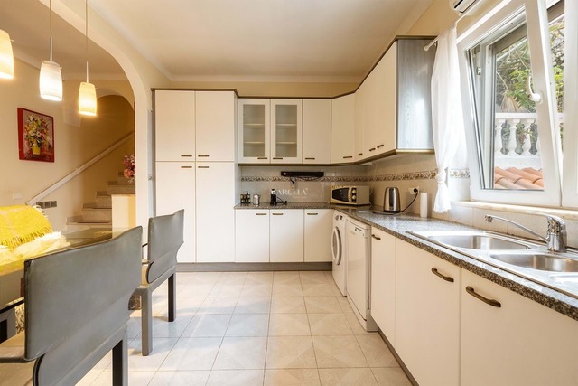 O piso superior é composto por uma ampla sala de estar em plano aberto e cozinha com lareira, bem como ar condicionado. Há 3 quartos com roupeiros embutidos e uma casa de banho familiar. O piso inferior é composto por uma área de estar menor com lareira a pellets, pequena cozinha, bem como um quarto e um escritório.