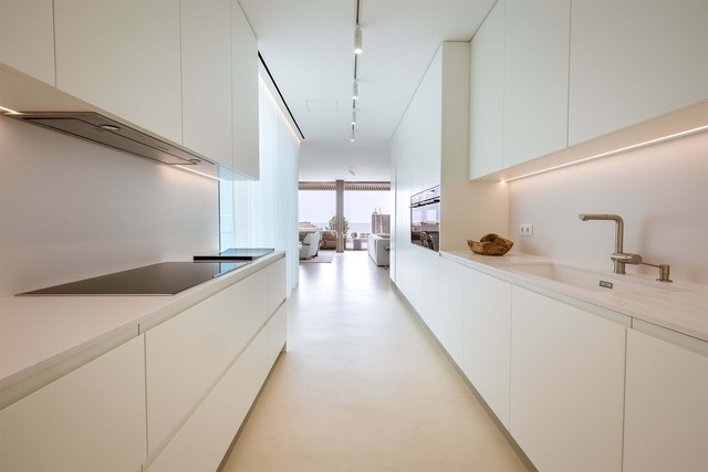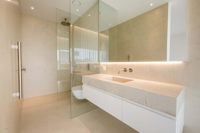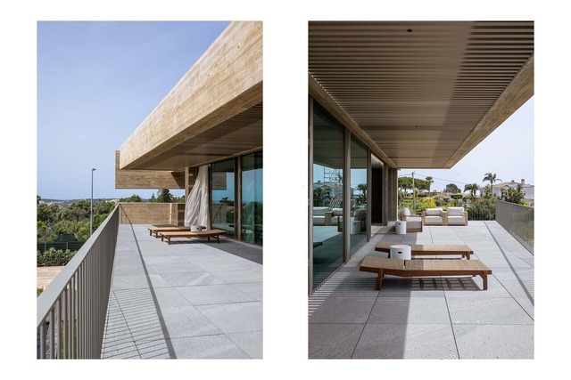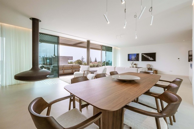 O primeiro andar é dedicado às áreas sociais, destacando-se uma ampla e luminosa sala de estar e jantar em plano aberto, integrada com uma moderna cozinha e zona de copa. Neste piso encontra-se também uma master com casa de banho independente, um WC de serviço e um hall. Tanto a suite como as áreas sociais beneficiam de acesso a um magnífico terraço orientado a sul, ideal para desfrutar do clima algarvio e da vista mar. Existe ainda um segundo terraço adjacente à cozinha, perfeito para refeições ao ar livre, e um terceiro terraço que permite o acesso à cobertura.