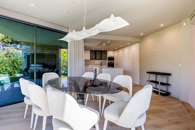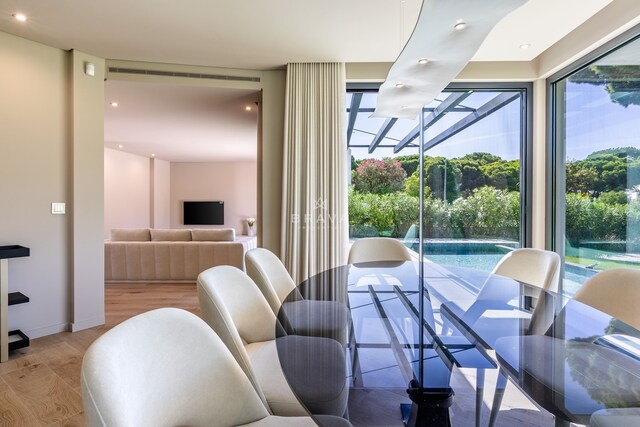 Sala de estar e jantar com acesso direto ao jardim, piscina e zona de BBQ