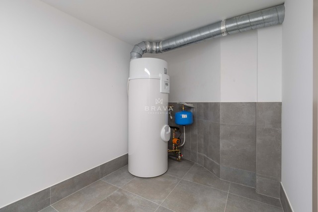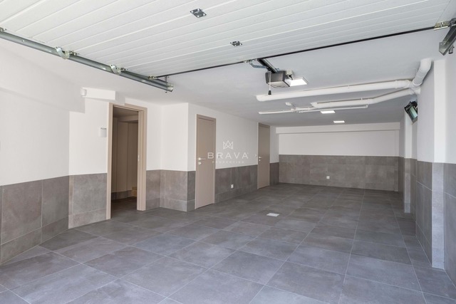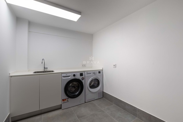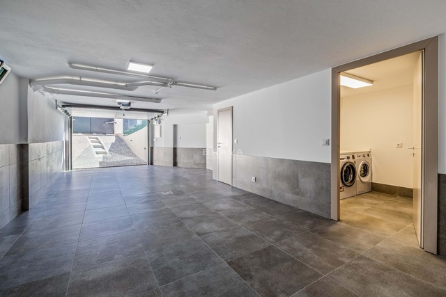 Garagem com zona de lavandaria equipada com máquinas de lavar e secar, lava-loiça e arrumos complementares na cave.