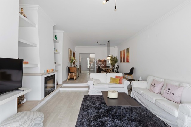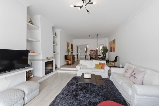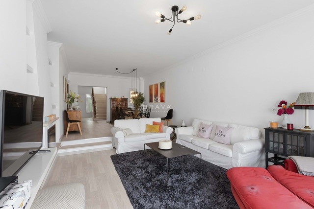 Distribui-se por três pisos. No piso térreo, sala de estar em desnível com zona de jantar, lareira e diferentes ambientes definidos. A sala e a cozinha totalmente equipada têm acesso direto ao logradouro. Neste piso existe ainda um quarto ensuite com base de duche e uma casa de banho de serviço.