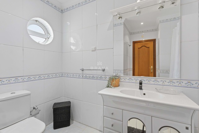 No primeiro andar, hall de distribuição para três quartos, um deles ensuite com banheira. Existe ainda uma casa de banho de apoio aos quartos, também com banheira. A suite e um dos quartos dispõem de varanda privada cada.