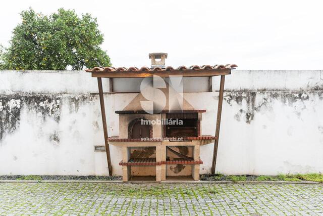 A zona exterior inclui uma garagem box fechada para duas viaturas, com espaço adicional para arrumos, e uma área descoberta ajardinada e pavimentada, ideal para lazer ou refeições ao ar livre.