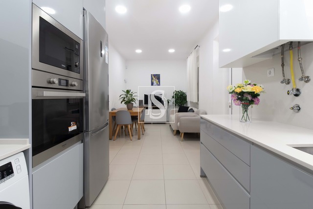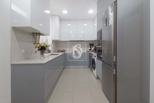 Cozinha moderna com bancada em pedra de quartzo e equipada com placa, forno, exaustor, frigorífico, micro-ondas, máquinas de lavar loiça e roupa, e esquentador.