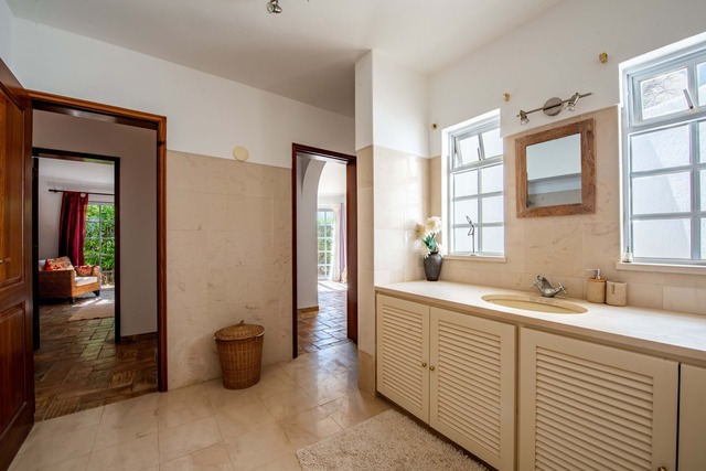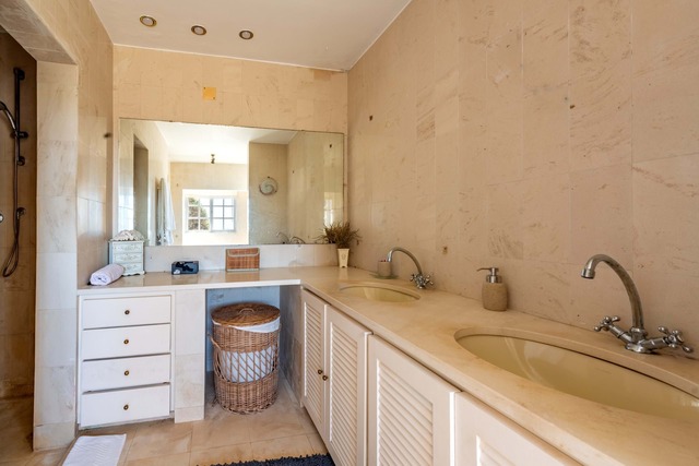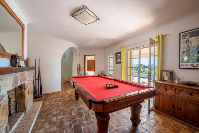 Uma atraente escada em espiral de pedra desce para três quartos duplos, todos com roupeiros embutidos, um dos quais com casa de banho privativa. Há um banheiro adicional que serve os outros dois quartos. Também neste nível inferior, há uma sala de jogos com mesa de bilhar e área de estudo. Esta área de lazer tem uma atraente lareira de pedra e portas que levam a um terraço maior com uma mesa de pingue-pongue.