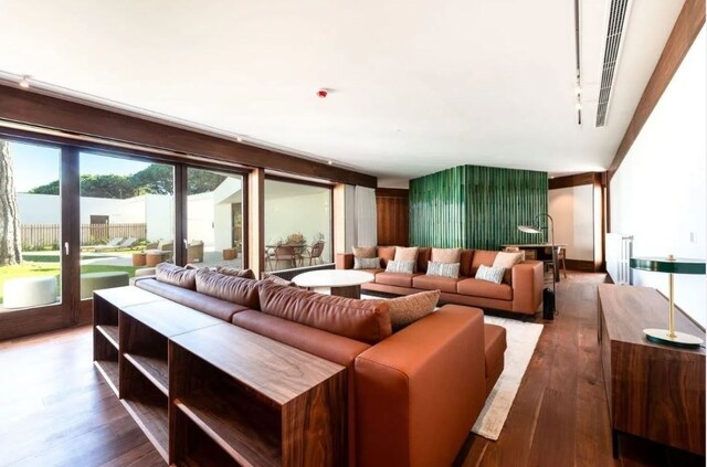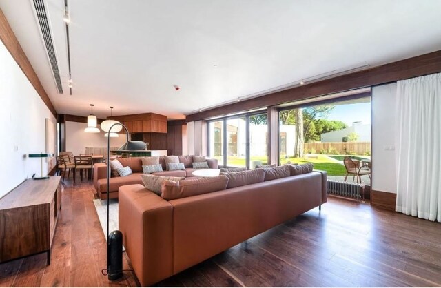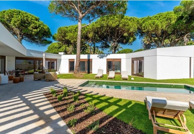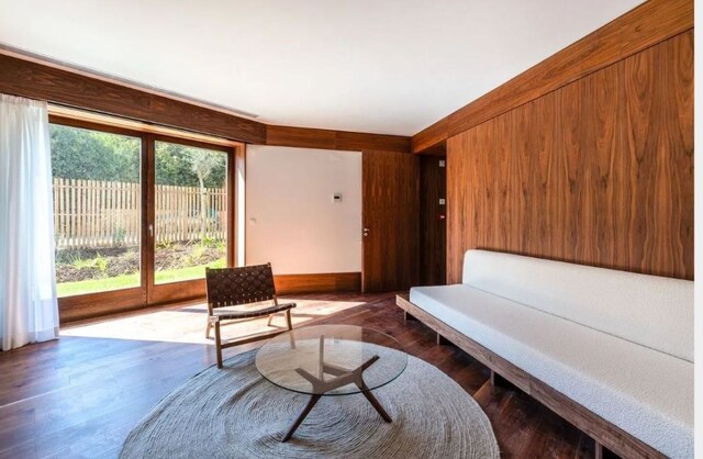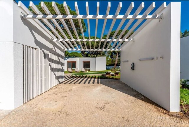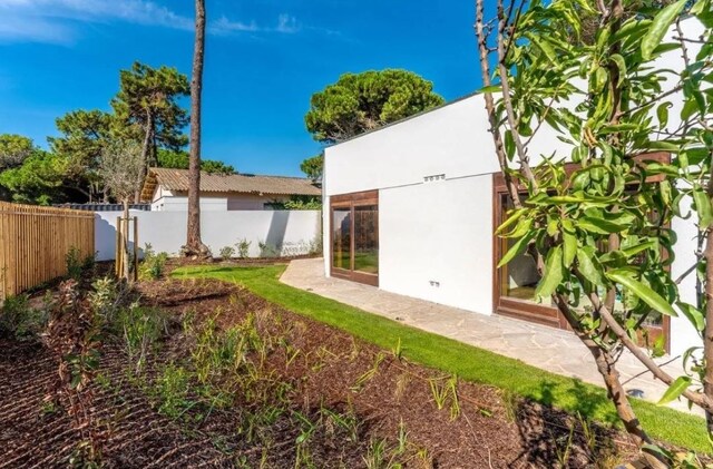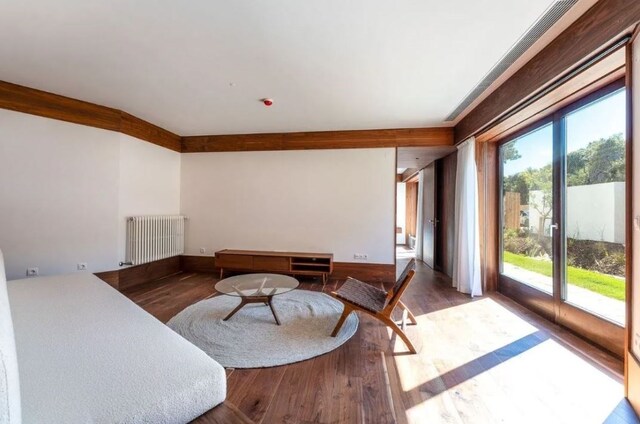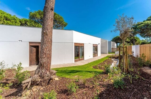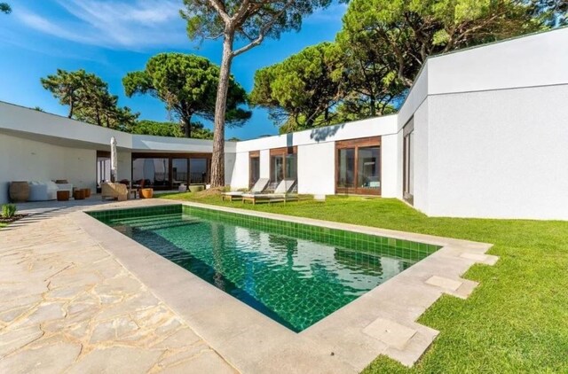 A habitação, de um só piso, apresenta uma arquitetura contemporânea, perfeitamente integrada na paisagem verde da Quinta da Marinha. O design foi pensado para proporcionar uma vivência harmoniosa entre o interior e o exterior, com amplas janelas que permitem a entrada de luz natural e a ligação direta ao jardim privativo.
