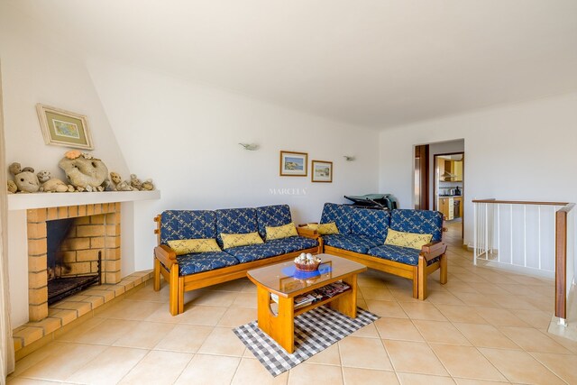 No primeiro piso encontra-se uma sala de estar com lareira e acesso a um terraço virado a sul, com vista para a piscina e jardins. Existe também uma cozinha totalmente equipada com dois terraços e um WC de serviço.