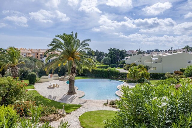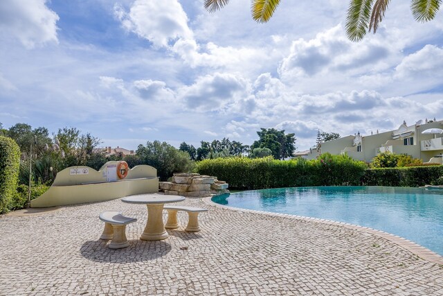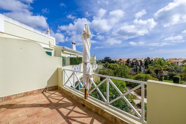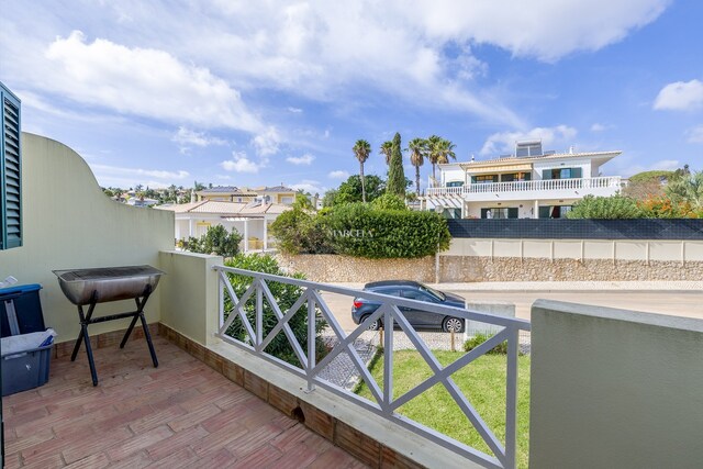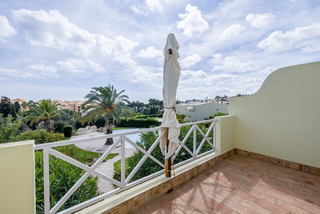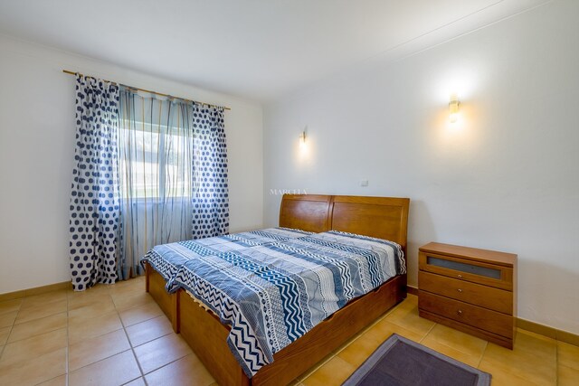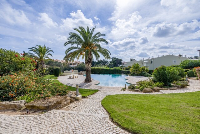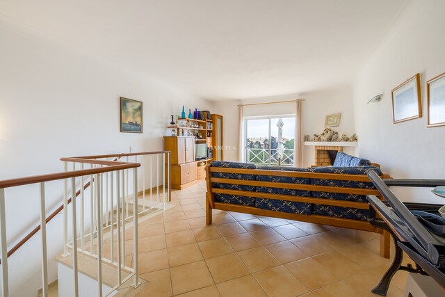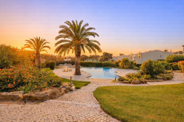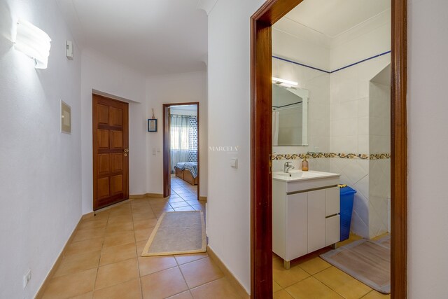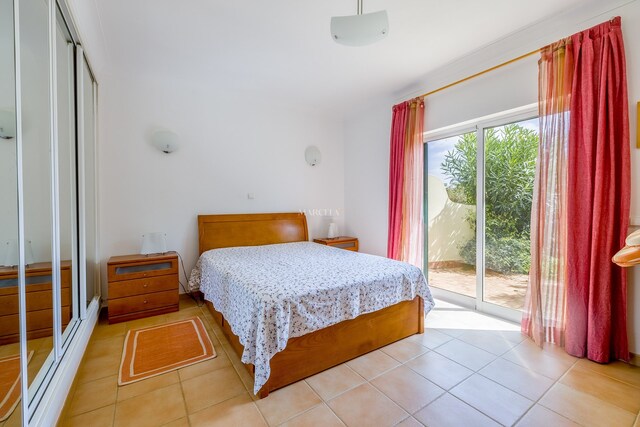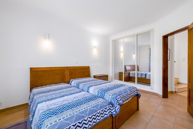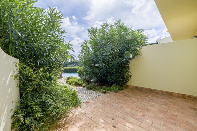 O imóvel desenvolve-se por dois pisos. No rés-do-chão, há um hall de entrada que dá acesso a dois quartos com roupeiros embutidos e uma casa de banho. O quarto principal tem acesso direto a um terraço privado, com fácil acesso à piscina e áreas de jardim comuns.