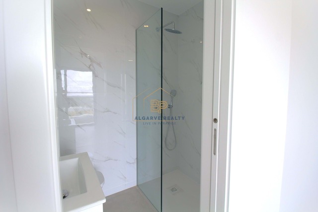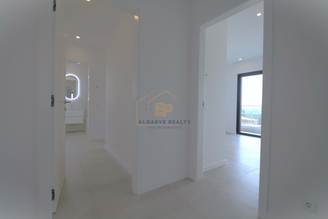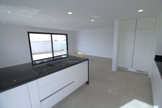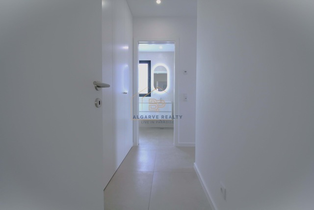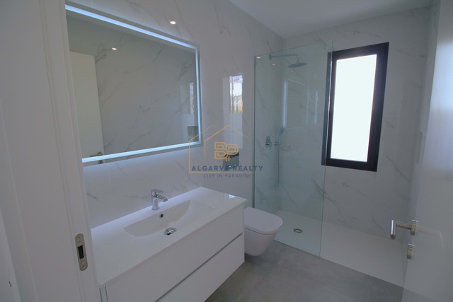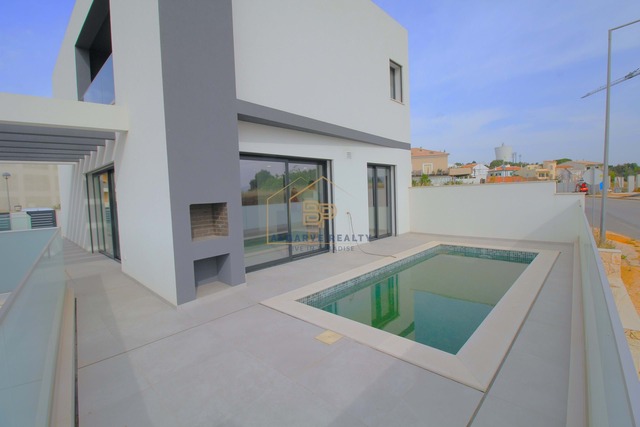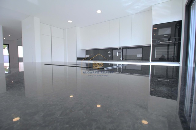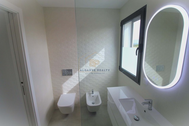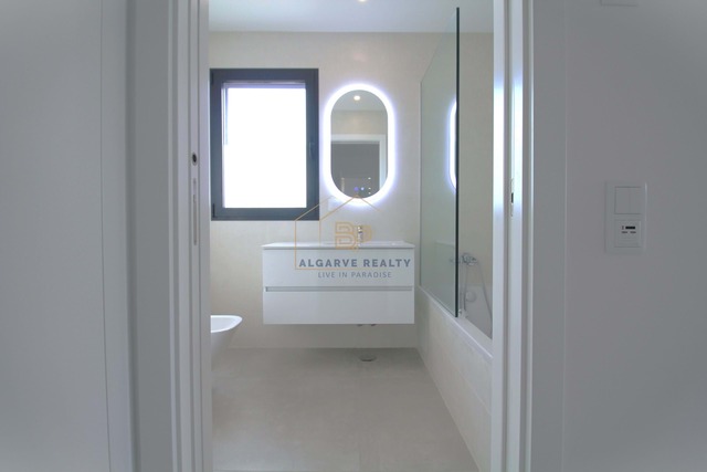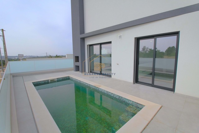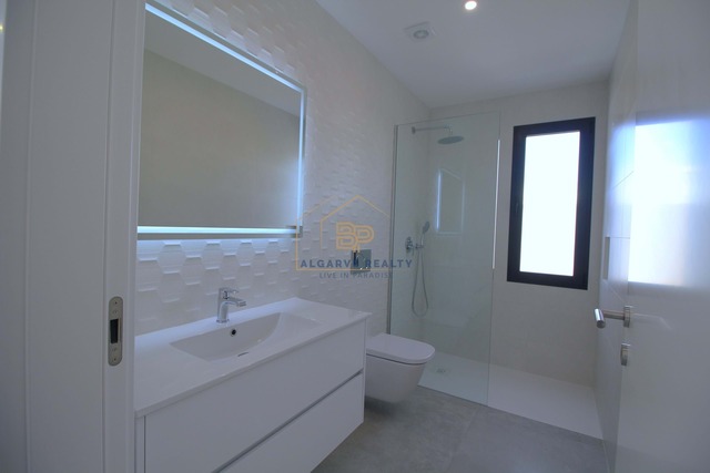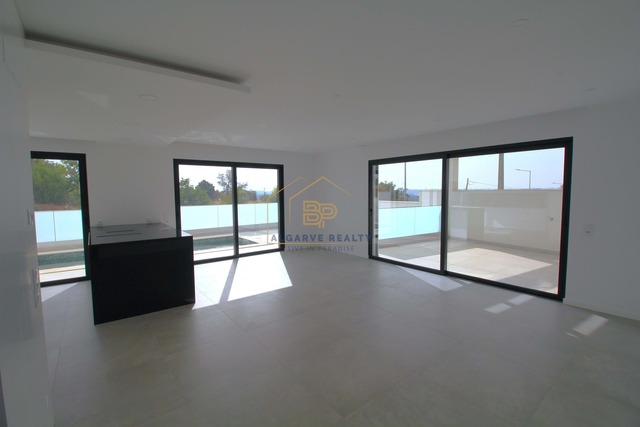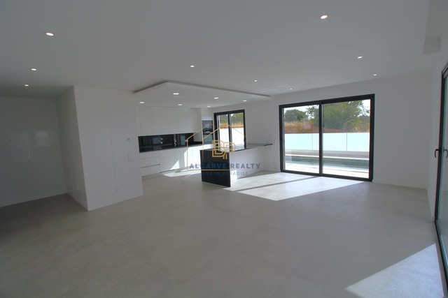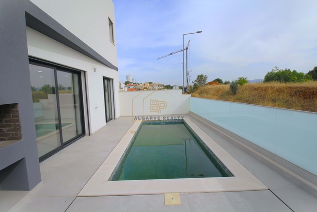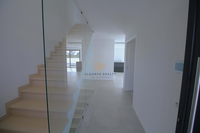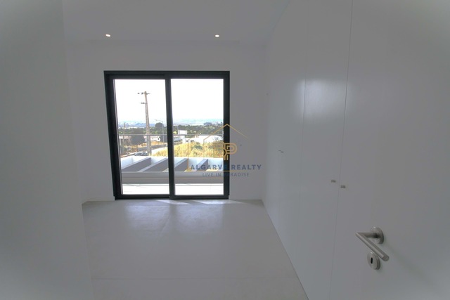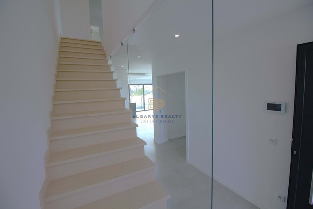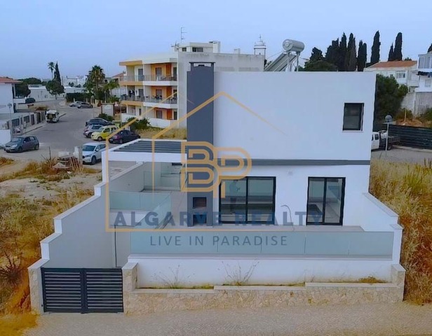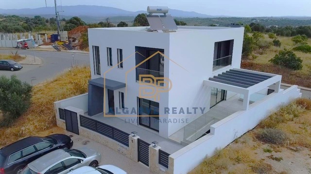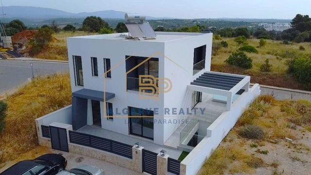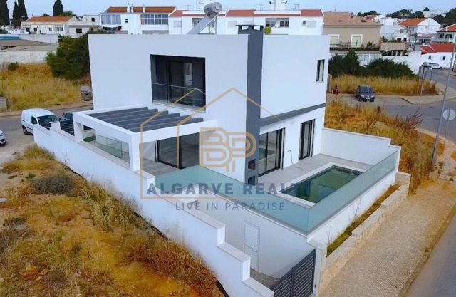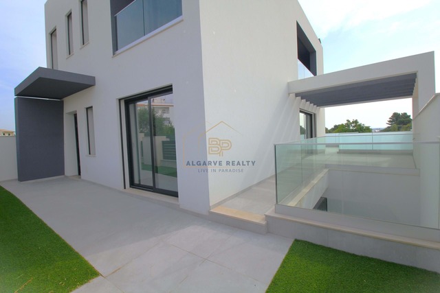 Moradia T3 de arquitetura contemporânea, situada na Mexilhoeira Grande (Portimão), inserida em urbanização moderna apenas com moradias unifamiliares.