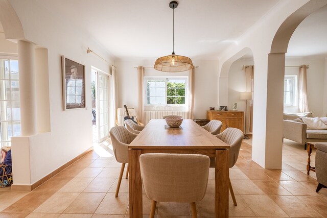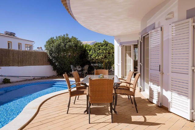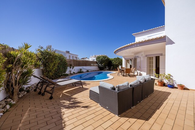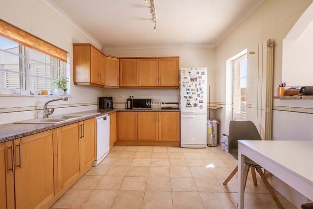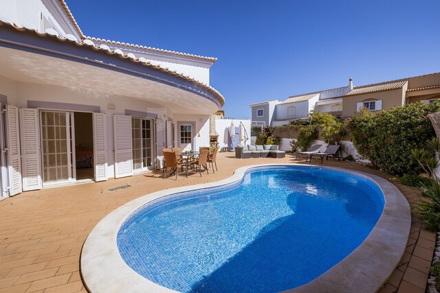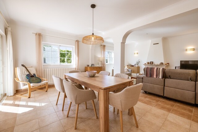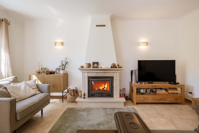 Um amplo hall de entrada dá-lhe as boas-vindas assim que entra na moradia. Este conduz a uma espaçosa e ensolarada sala de estar e de jantar com lareira. A cozinha totalmente equipada e com balcão de pequeno-almoço dá acesso a uma acolhedora área de estar e, posteriormente, à piscina e à zona de churrasco. Ideal para refeições ao ar livre sob o sol do Algarve.