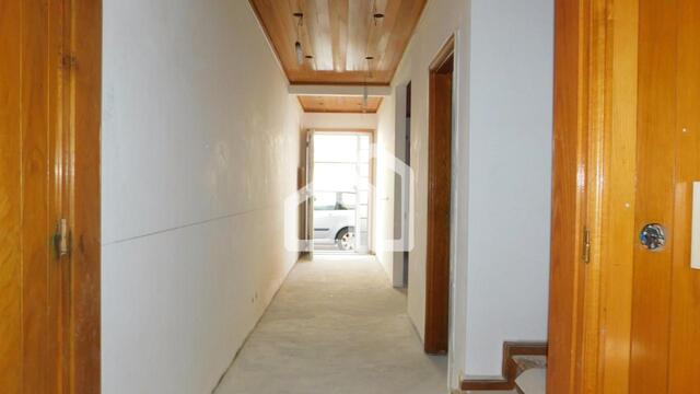 O rés-do-chão contempla um amplo hall de entrada, cozinha equipada, sala com fogão de sala, wc completo com base de chuveiro e garagem.