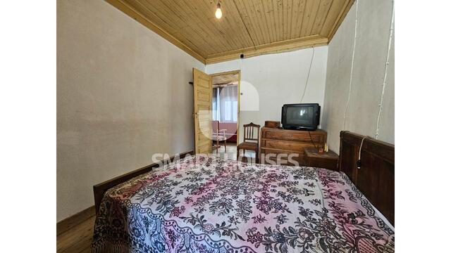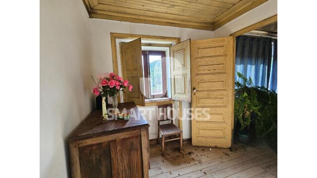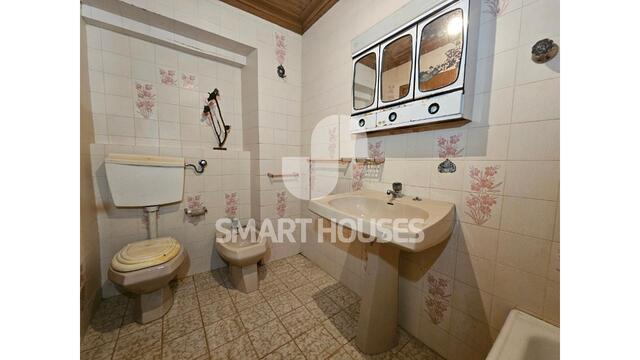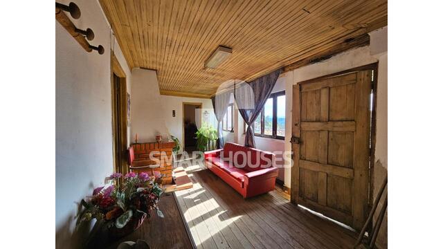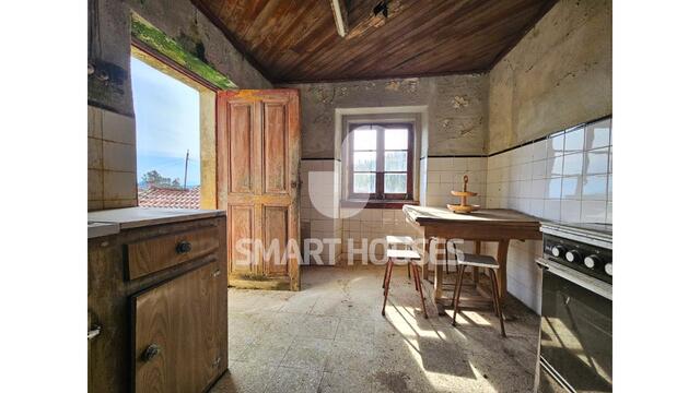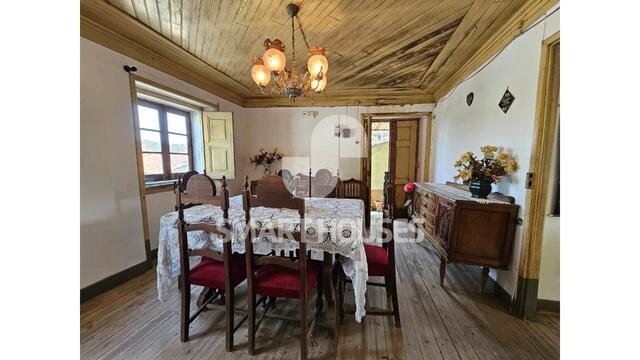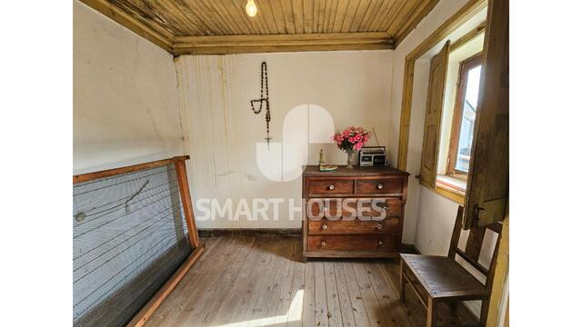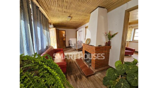 - piso de entrada (1º andar, ao qual se acede através de escadaria exterior diretamente pela rua) onde se entra diretamente para a sala de jantar, ampla, e daqui para sala de estar com lareira e envidraçado com vistas sobre a serra e terrenos envolventes. Desta sala acede-se aos 3 quartos e a 1 W.C. completo; também se acede a varanda exterior sobre o pátio interior.