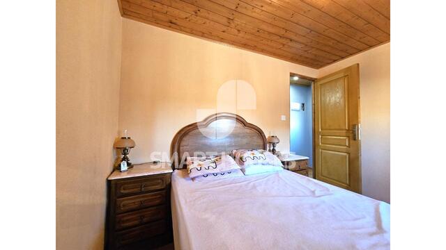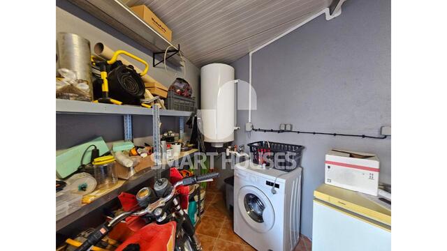 - Rés-chão, com entrada através da porta principal diretamente para a sala, ampla, com cozinha integrada e completamente mobilada; daqui acede-se ao hall de escadas ao piso superior. Neste piso existe acesso directo à garagem para 1 automóvel e arrumos.
