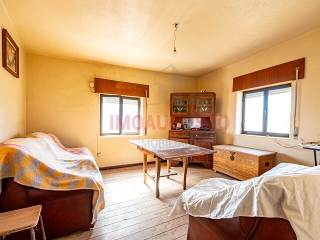 A moradia principal dispõe de 2 quartos, wc, sala e cozinha no 1º piso e arrumos no rés-do-chão. Terá ainda acesso a uma segunda moradia com uma divisão ampla e garagem. Estrutura com placa de cimento entre pisos e telhado em bom estado.