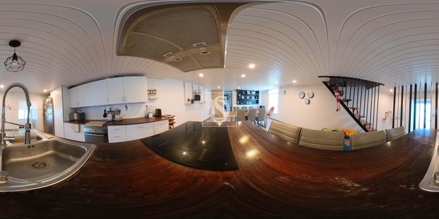 No piso térreo, encontramos uma cozinha e sala de jantar em open space, sala de estar, quarto de máquinas e instalação sanitária com banheira.