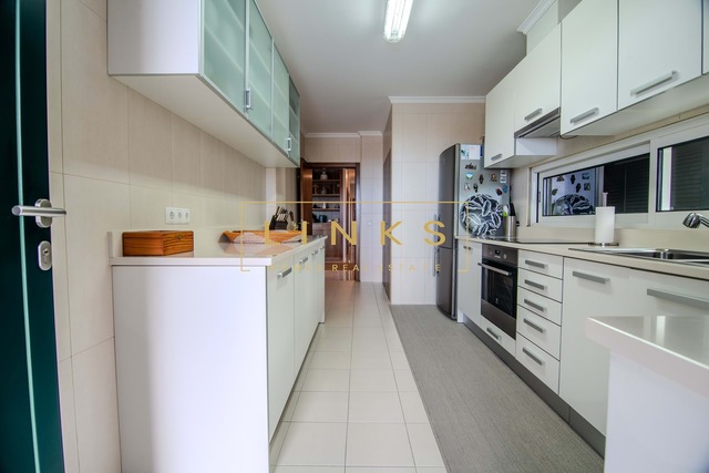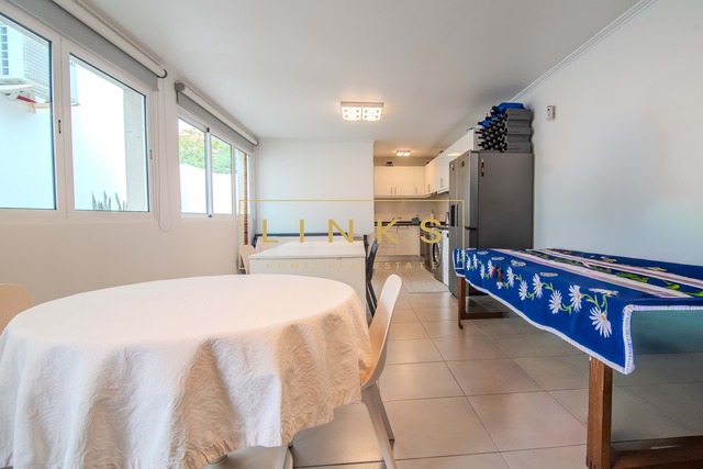 Cozinha moderna e totalmente equipada, com sala de estar e jantar.