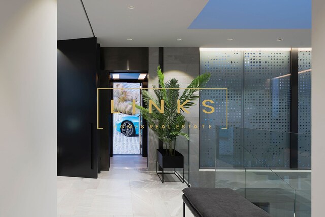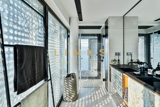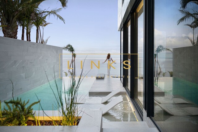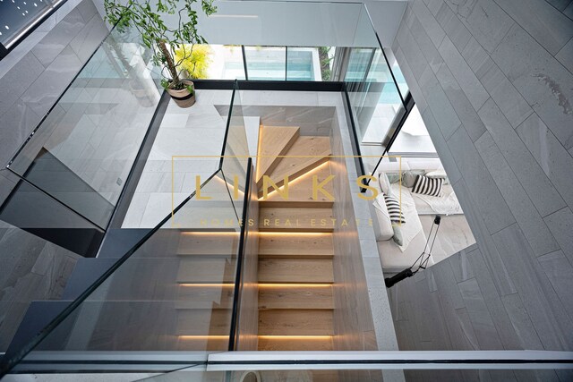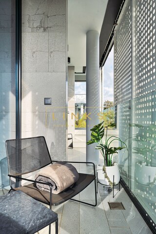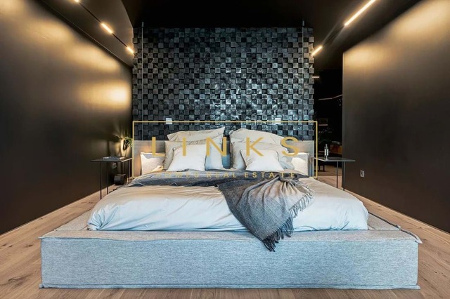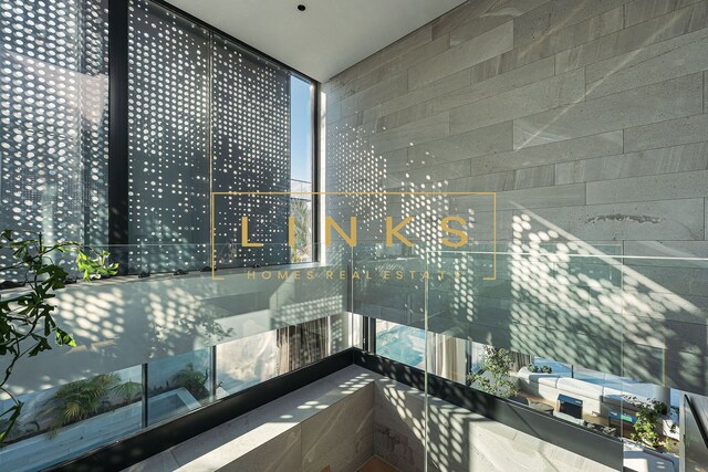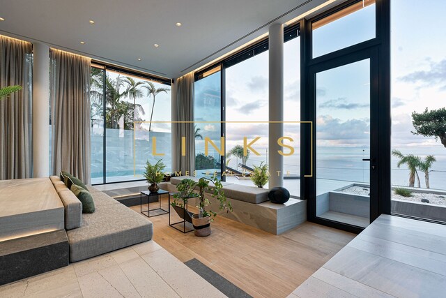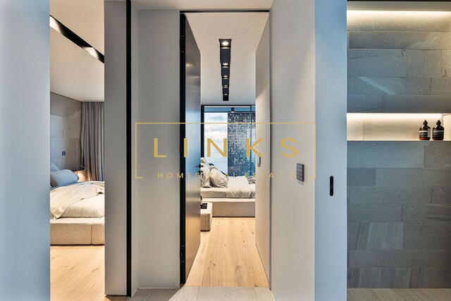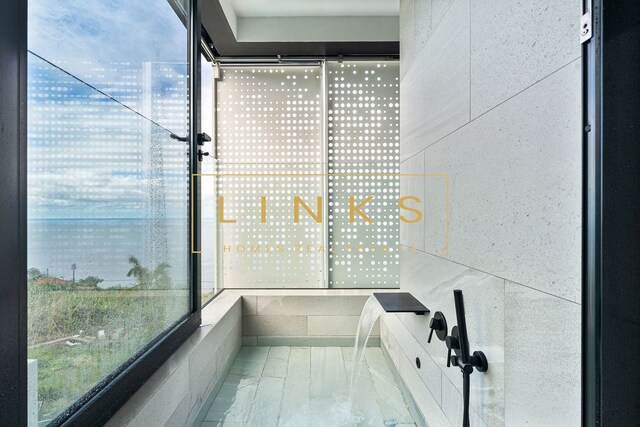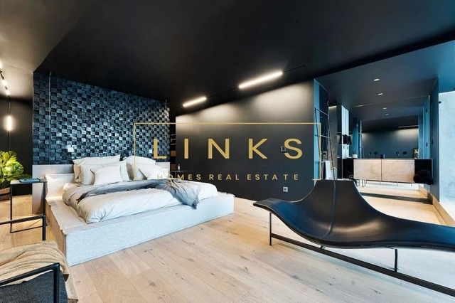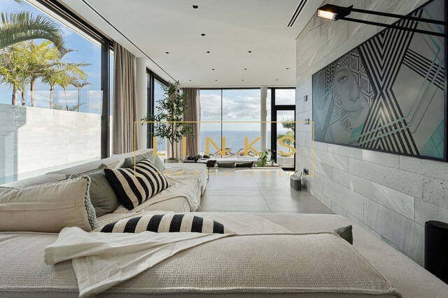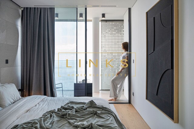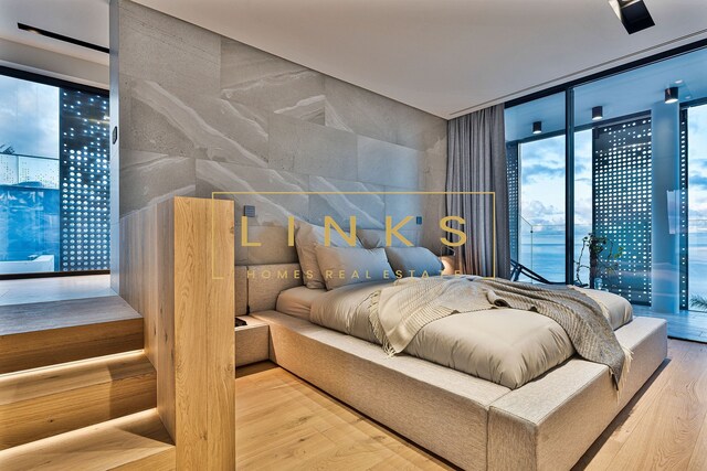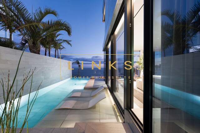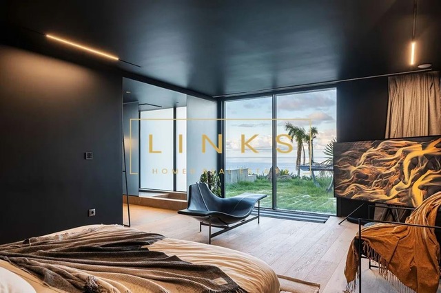 Ao subir as escadas ou usar o elevador, encontramos o primeiro andar, que é composto pelo quarto principal, onde há uma casa de banho privativa, com janelas do chão ao teto, vista para os jardins paisagísticos e mar. O interior da casa utiliza materiais naturais da mais alta qualidade, criando um ambiente contemporâneo. Integra ainda um quarto duplo adicional e um quarto individual polivalente que pode ser utilizado para estudo ou como preferir. Estes dois quartos partilham uma casa de banho totalmente equipada.
