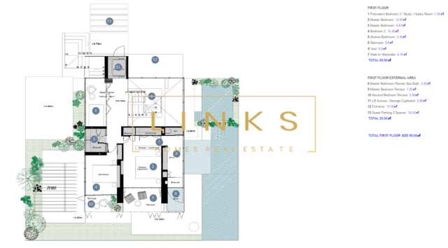 Ao subir as escadas ou usar o elevador, encontramos o primeiro andar, que é composto pelo quarto principal, onde há uma casa de banho privativa, com janelas do chão ao teto, vista para os jardins paisagísticos e mar. O interior da casa utiliza materiais naturais da mais alta qualidade, criando um ambiente contemporâneo. Integra ainda um quarto duplo adicional e um quarto individual polivalente que pode ser utilizado para estudo ou como preferir. Estes dois quartos partilham uma casa de banho totalmente equipada.