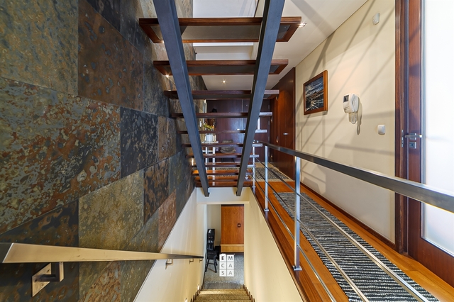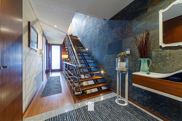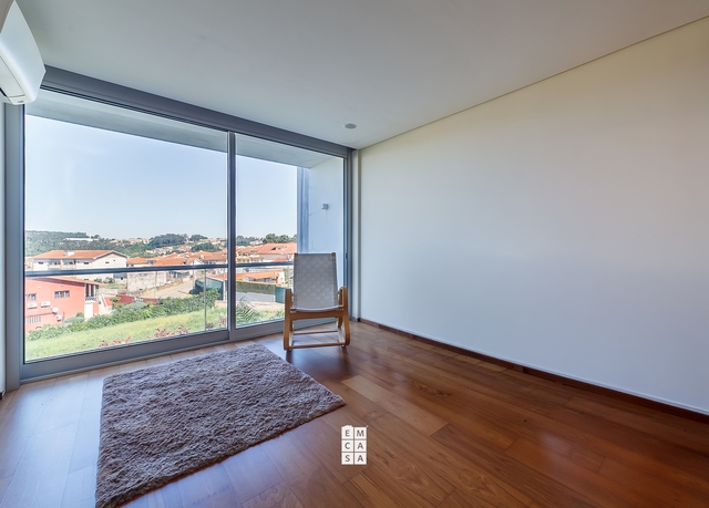 - No piso superior, a moradia apresenta três quartos com acesso a varandas, destacando-se uma suíte que garante maior privacidade e conforto. Este piso conta ainda com uma casa de banho completa, equipada com base de duche e banheira, de apoio aos restantes quartos;