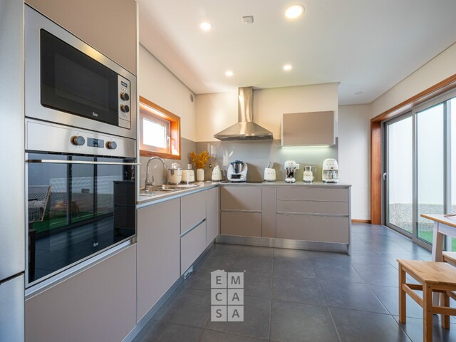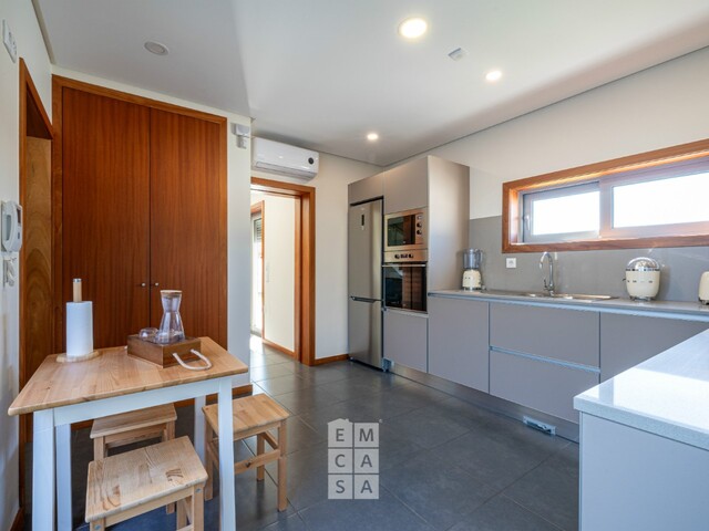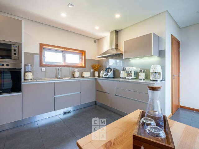 Cozinha totalmente equipada com, frigorífico, micro-ondas, forno, máquina de lavar louça, exaustor e placa de indução.