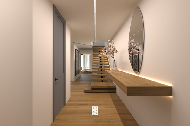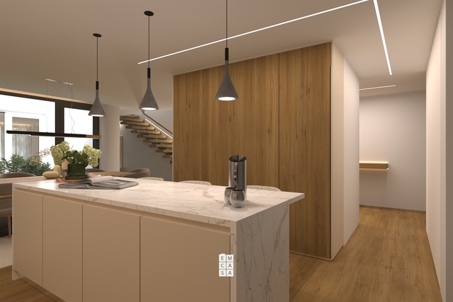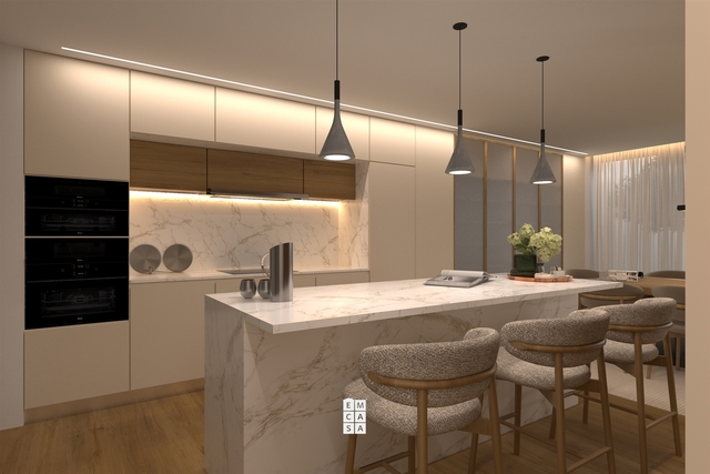 A zona social destaca-se pela ligação harmoniosa entre sala e cozinha, criando um ambiente moderno e acolhedor, ideal para o dia a dia em família e momentos de convívio. A cozinha será equipada e os materiais foram criteriosamente selecionados, conforme mapa de acabamentos, privilegiando qualidade, durabilidade e conforto.