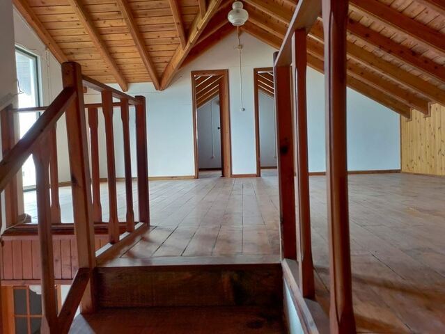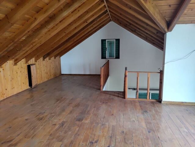 1º Piso com 2 quartos, sala comum (c/ varanda), instalação sanitária e cozinha; Sótão com espaço amplo e varanda.