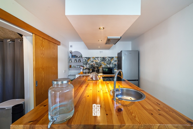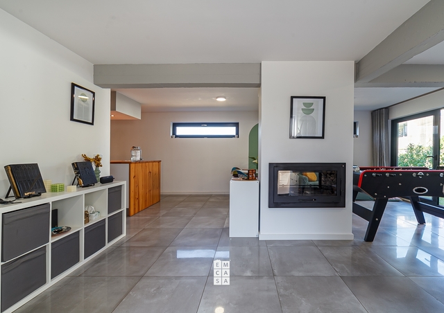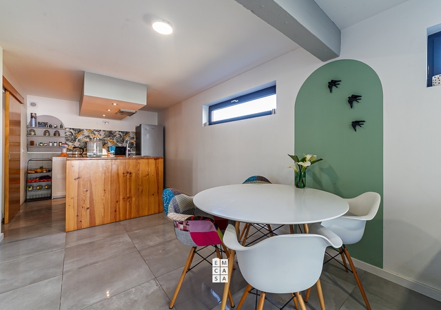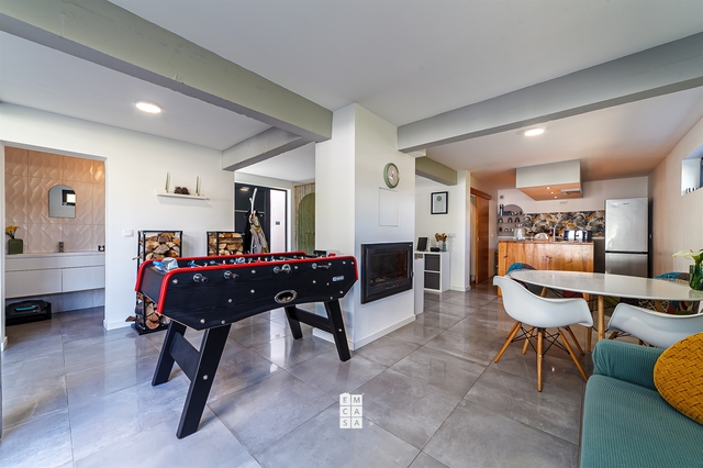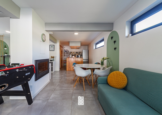 No piso inferior, a casa oferece uma ampla e moderna área em open space, onde sala e cozinha se fundem num ambiente elegante e funcional, perfeito para momentos de convívio em família ou entre amigos. Este piso conta ainda com uma casa de banho de apoio.