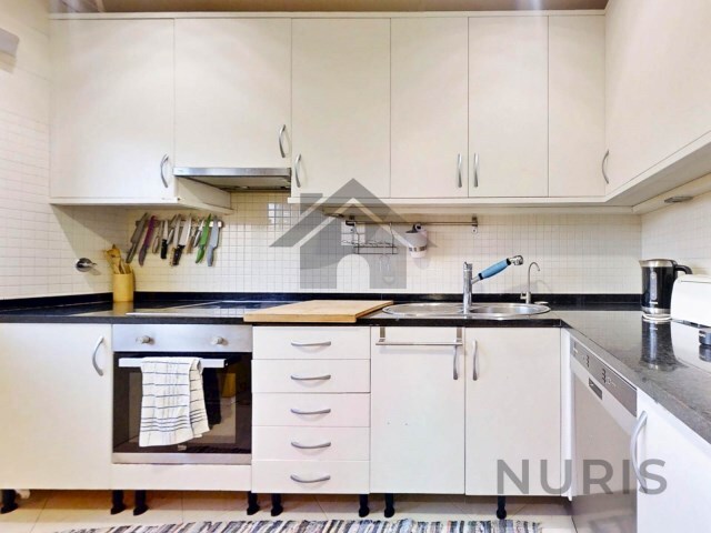 Cozinha totalmente equipada com máquina de lavar loiça, máquina de lavar e secar roupa, micro-ondas, forno, placa elétrica e exaustor.