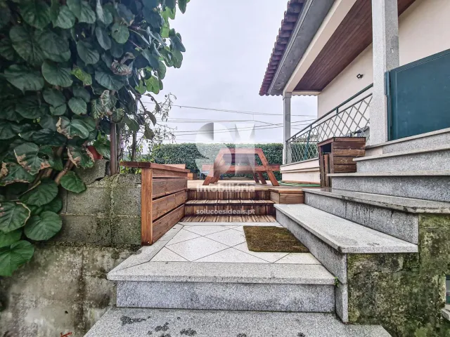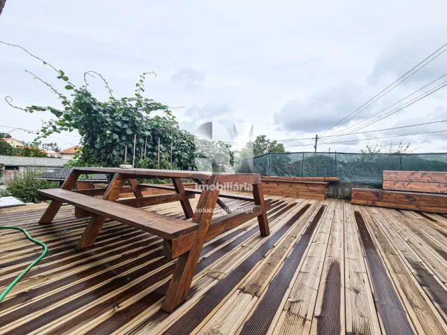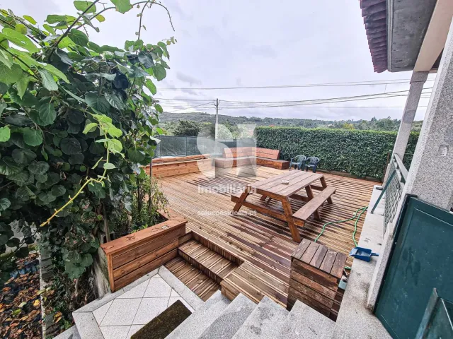 - Zona posterior com patio com deck em madeira e barracão para arrumações.