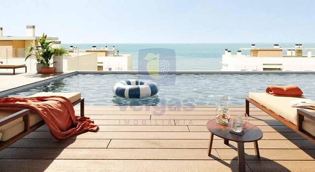Na cobertura do edifício existe um terraço comum destinado a lazer e solário, mobilado com piscina comum e pala de ensombramento com vista para a praia.