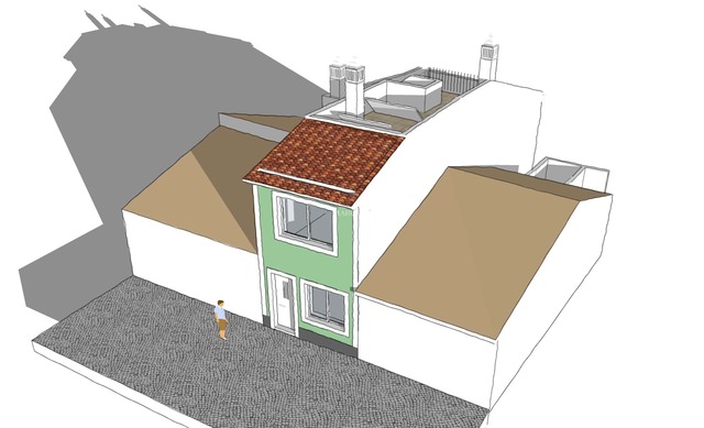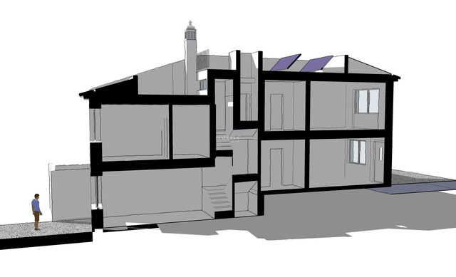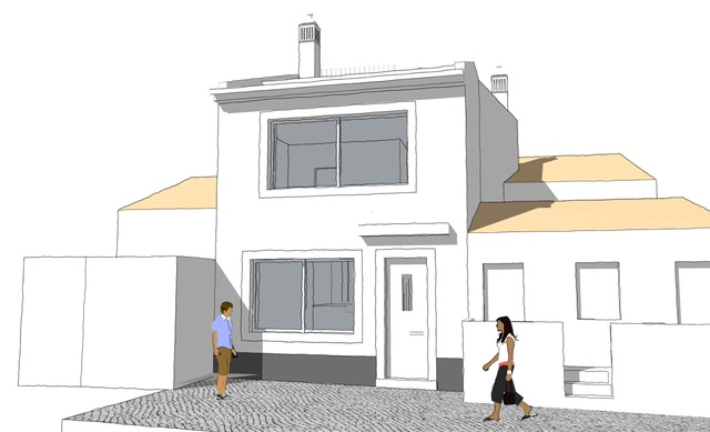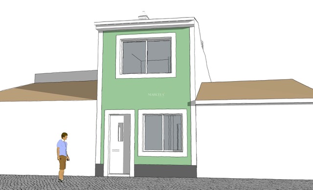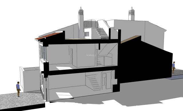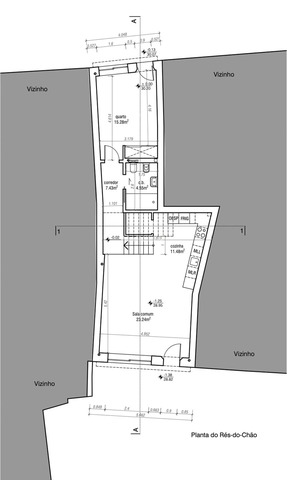 O projeto prevê, no piso térreo, uma área social em open space com sala de estar, sala de jantar e cozinha, complementada por uma casa de banho de serviço e um quarto/escritório.