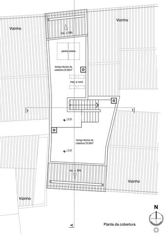 A cobertura contempla uma zona de refeições ao ar livre e uma área técnica para instalação de equipamentos.