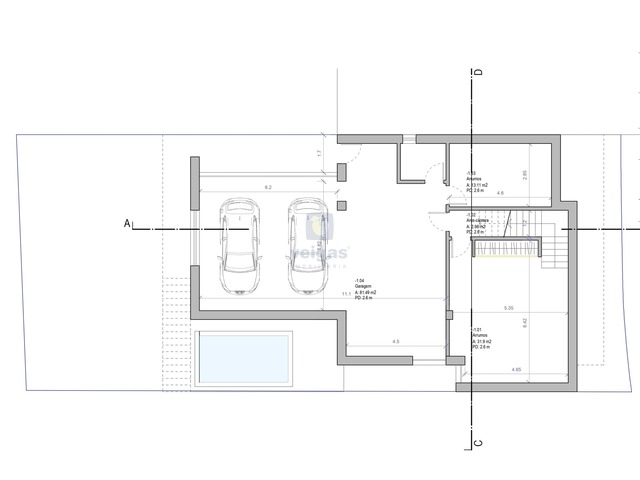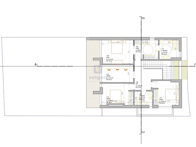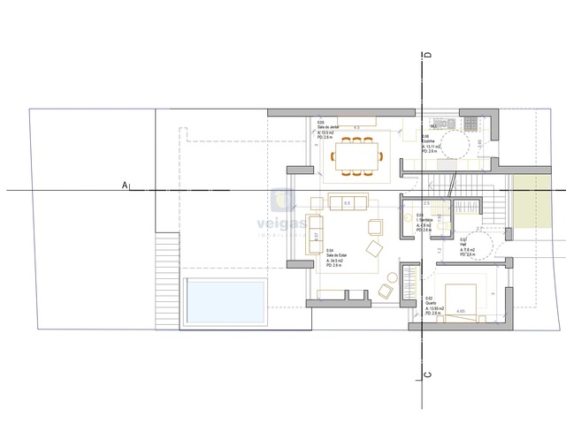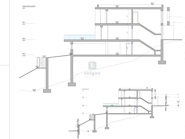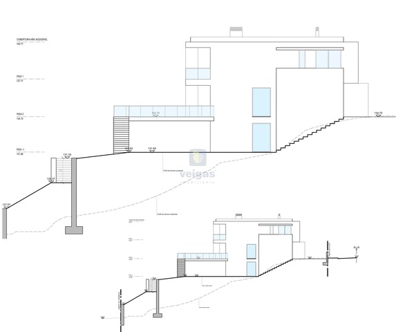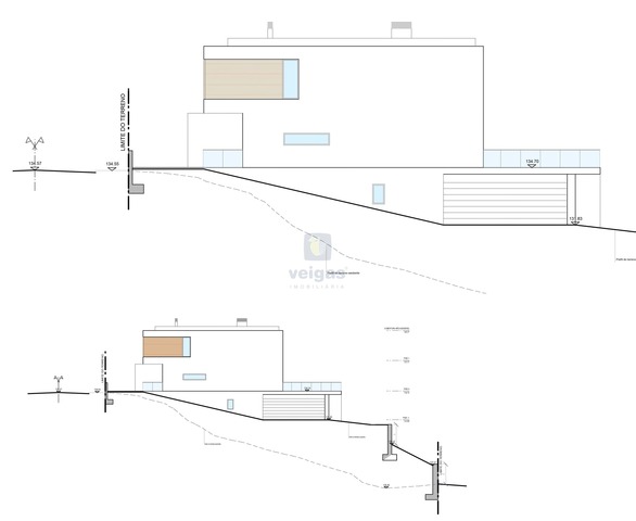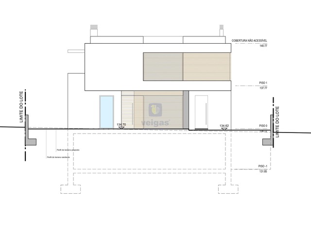 Com estudo de projeto para construção de uma moradia isolada de arquitetura moderna constituída por 3 pisos, cave, rés de chão e primeiro andar, com piscina. Área de implantação de 160m2, área bruta de construção 411 m2.