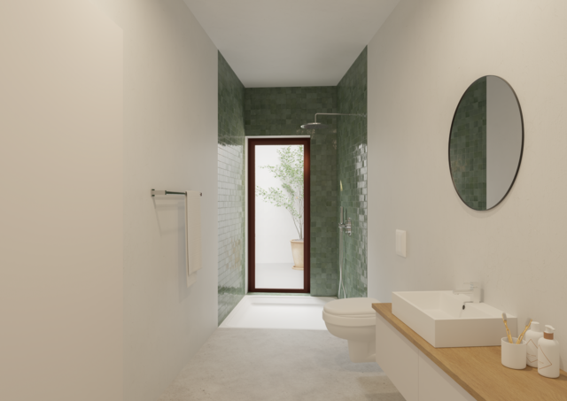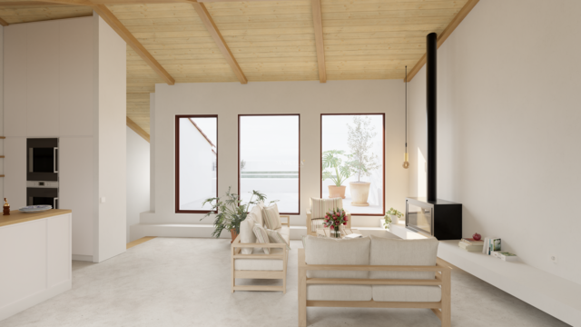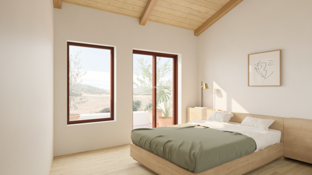 No rés do chão (55m2) encontrará os três quartos, duas casas de banho, pátio e sala técnica. Escadas que conduzem ao primeiro andar, onde existe uma cozinha/sala de jantar em plano aberto que levam à sala de estar com acesso ao terraço e à piscina oferecendo vista para o campo.