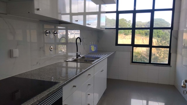 The social area has a large living room, with fireplace and direct access to the balcony, creating a cozy and bright environment for family moments or to receive guests. The kitchen is equipped with a hob, oven and extractor fan, ready to respond to the demands of everyday life with practicality.