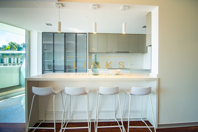 The living area consists of a spacious open-concept living room connected to the kitchen, creating a modern, functional, and very bright atmosphere. The kitchen is fully equipped with high-quality appliances and offers excellent storage space.