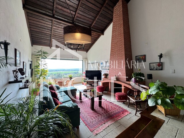 - Living room with fireplace, high wooden ceilings, with access to porch and panoramic views