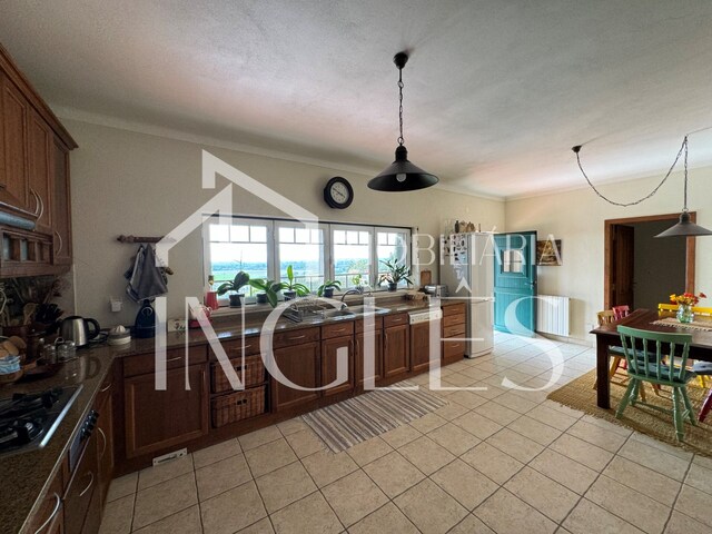 - Kitchen equipped with hob, oven, microwave, extractor fan, with access door to porch overlooking the Lezíria, laundry and pantry