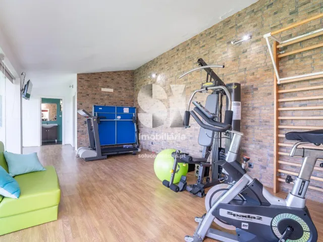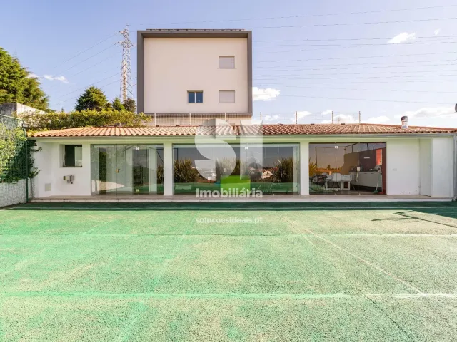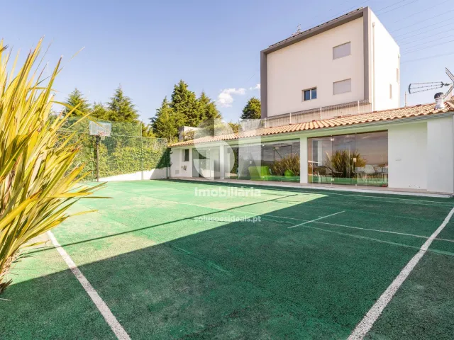 No exterior e retaguarda da moradia temos um primeiro patamar com algumas árvores e uma piscina e no segundo e ultimo patamar temos um campo de ténis, servido de um anexo com 75 m2 equipado com cozinha, churrasqueira, sala e um wc completo.