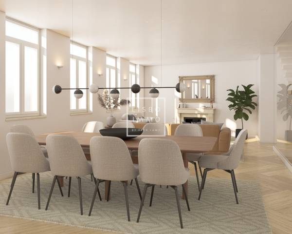 On the first floor, a living-dining room of 46 m² with lots of natural light with large bay windows, and the fitted kitchen of 30m2 with its monumental central island and its 4 windows overlooking the garden.