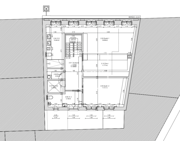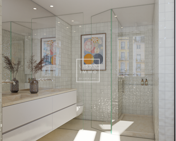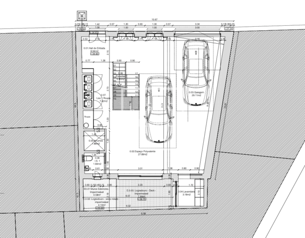 Start the visit on the ground floor, its 28m2 parking space for one or two cars, its laundry area of 10m2 and a bedroom with dressing room and bathroom.